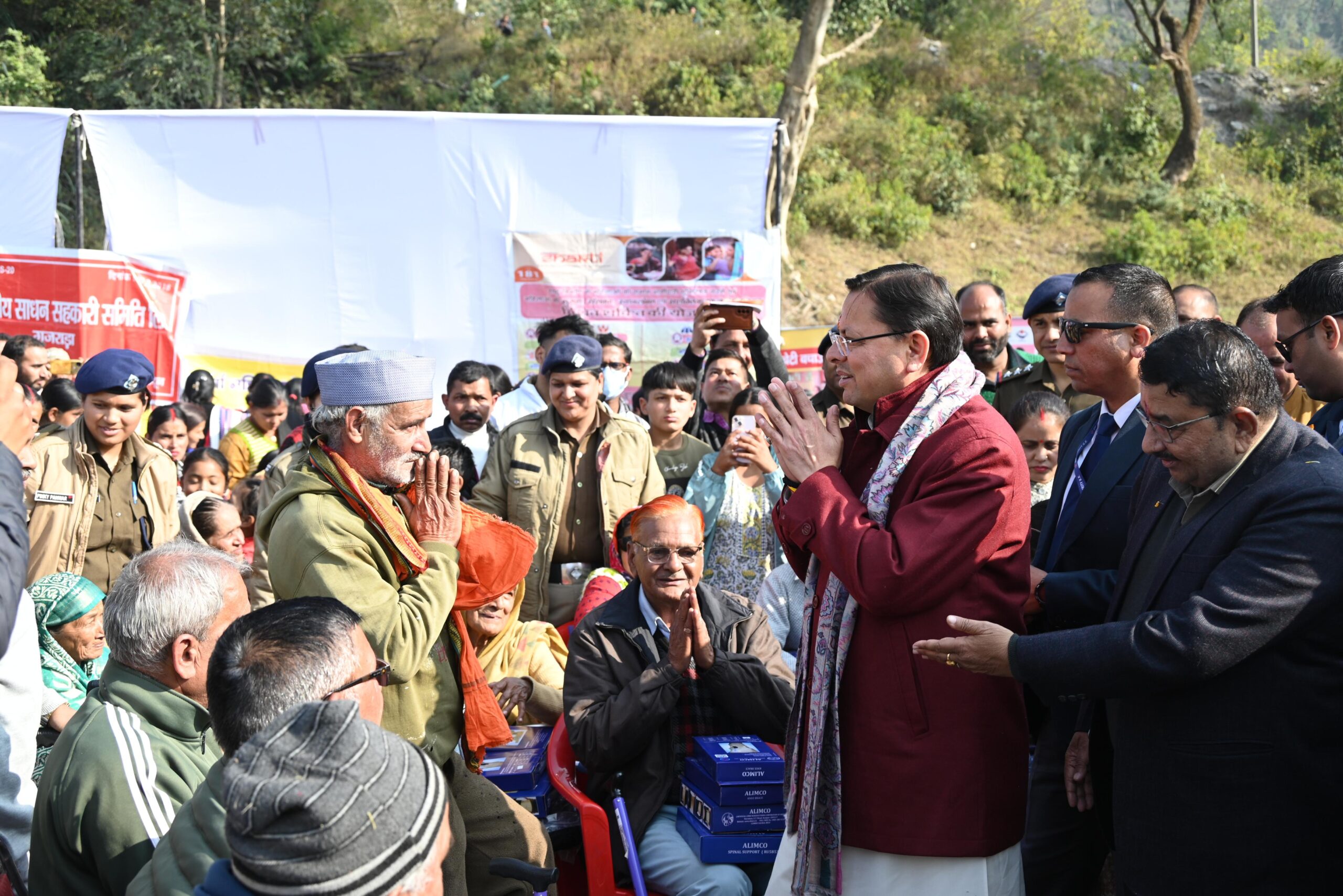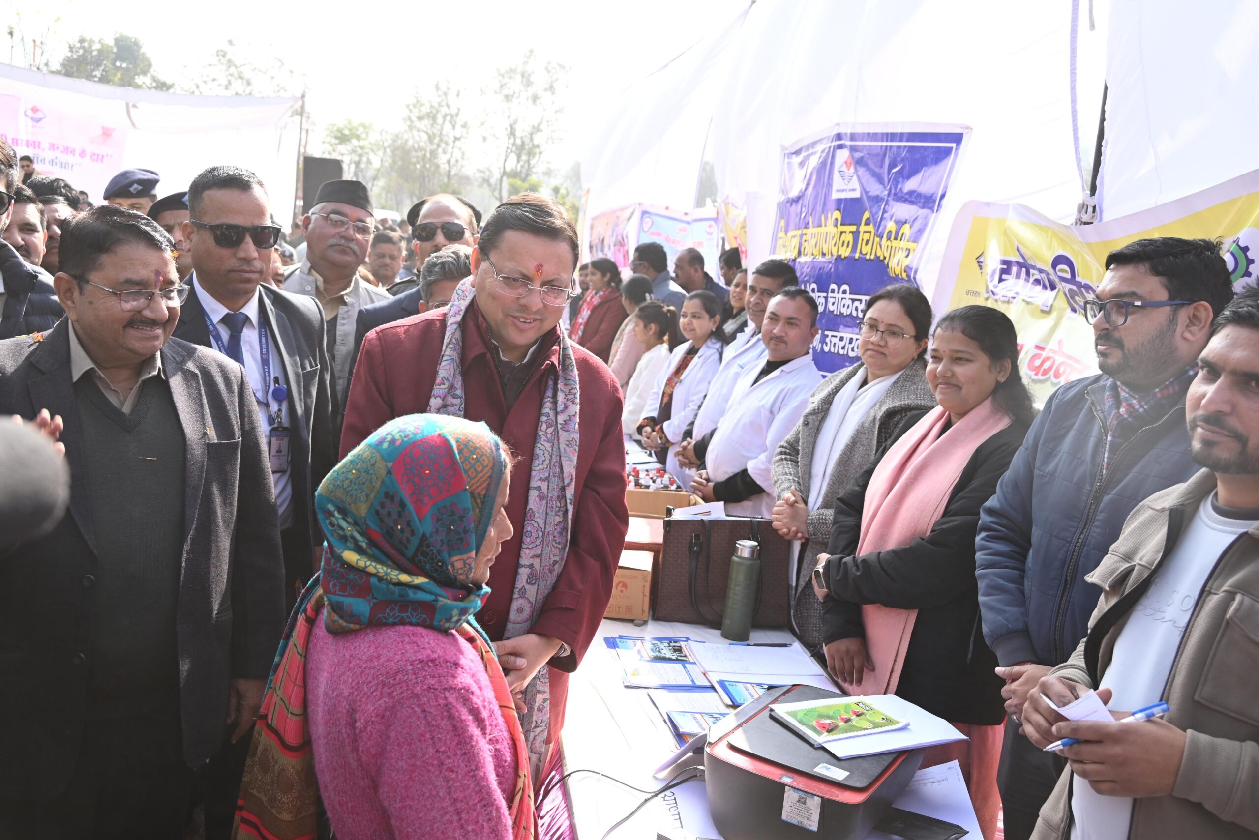 जनसेवा को समर्पित संकल्प “जन-जन की सरकार, जन-जन के द्वार” अभियान के अंतर्गत शुक्रवार को रायपुर ब्लॉक की न्याय पंचायत खैरी मानसिंह में आयोजित बहुउद्देशीय शिविर में मुख्यमंत्री श्री पुष्कर सिंह धामी ने स्वयं सहभागिता की। मुख्यमंत्री ने शिविर में स्थापित विभिन्न विभागीय स्टॉलों का निरीक्षण किया और योजनाओं का लाभ पंक्ति में अंतिम व्यक्ति तक पहुँचाने के निर्देश अधिकारियों को दिए।