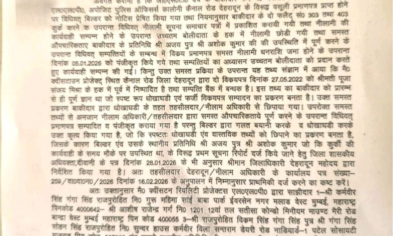 नीलामी की कार्रवाई संपन्न होने के बाद उच्चतम बोलीदाता के हक में नीलामी छोड़ी गई और सभी औपचारिकताएं, फर्म के प्रतिनिधि की उपस्थिति में पूर्ण की गई। पांच जनवरी को दोनों पलेटों की बोली लगाई गई और उच्चतम बोलीदाता को फ्लैट प्रदान करते हुए 02 फ्लैट 303 व 403 कुर्क करने के बाद उनकी नीलामी सूचना समाचारपत्रों मे प्रकाशित कराई गई। नीलामी की कार्रवाई संपन्न होने के बाद उच्चतम बोलीदाता के हक में नीलामी छोड़ी गईं कार्रवाई संपन्न की गई। समस्त प्रक्रिया के बाद संज्ञान में आया कि मैसर्स क्वींसटन प्रोजेक्ट ने पूर्व में ही दो विक्रयपत्र 27 मई 2022 को पूजा संजय मिश्रा के हक में निष्पादित यह फ्लैट बैंक में बंधक हैं। इस सारे प्रकरण को बिल्डर ने धोखाधड़ी करते हुए तहसीलदार व नीलाम अधिकारी से छिपाया गया था। तथ्यों से अंजान नीलाम अधिकारी व तहसीलदार की ओर से समस्त औपचारिकताएं पूर्ण करने के बाद प्रमाणपत्र संपादित व पंजीकृत कराया गया है। इस मामले में राजपुर थाना पुलिस ने कर्मवीर सिंह निवासी गुरु महिमा साई बाबा पार्क, वेस्ट मुंबई, महाराष्ट्र, आशीष राजेंद्र गर्ग निवासी बांद्रा वेस्ट मुंबई महाराष्ट्र, राजपुरोहित विक्रम सिंह निवासी पटेल सोसाइटी गुजरात व उनके स्थानीय प्रतिनिधि अजय काठबंगला कैनाल के विरूद्ध मुकदमा दर्ज करा दिया है।