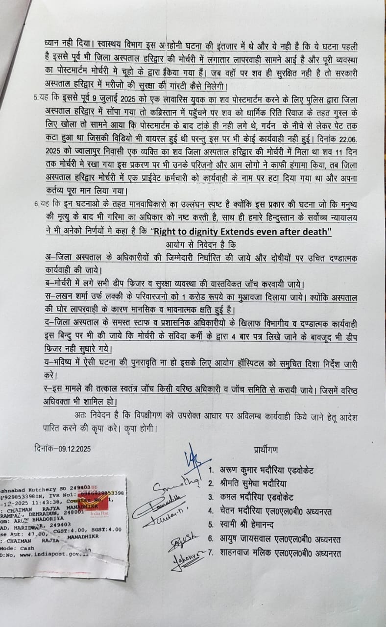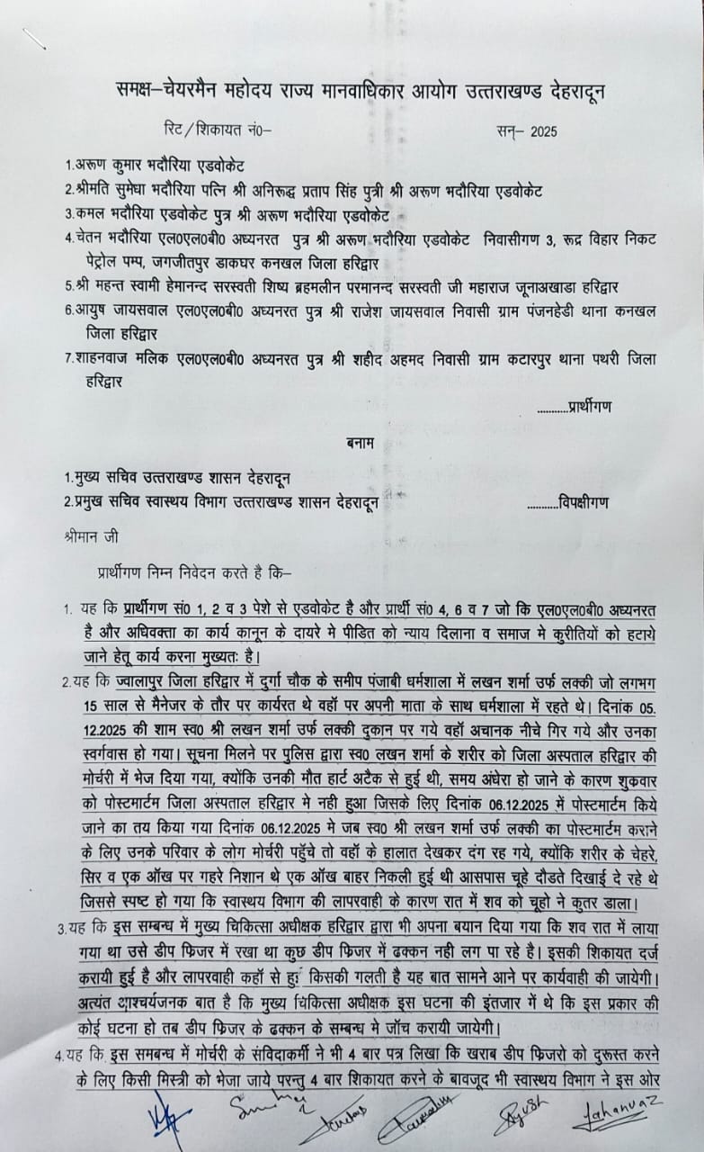 जिला हरिद्वार हॉस्पिटल में ज्वालापुर के निवासी लखन शर्मा उर्फ लकी की मृत्यु के के मामले को को देखते हुए हरिद्वार के अरुण भदोरिया एडवोकेट, कमल भदोरिया एडवोकेट ,श्रीमती सुमेधा भदोरिया एडवोकेट पत्नी श्री अनिरुद्ध प्रताप सिंह, चेतन भदोरिया LLB अध्यनरत ,आयुष जायसवाल LLB अध्यनरत शाहनवाज मलिक LLB अध्यनरत श्री महंत स्वामी हेमानंद सरस्वती द्वारा राज्य मानवाधिकार आयोग उत्तराखंड देहरादून ने प्रमुखसचिव उत्तराखंड , प्रमुख सचिव स्वास्थ्य विभाग उत्तराखंड शासन देहरादून को पक्षकार बनाते हुए याचिका दायर की है याचिका में बताया गया कि लखन शर्मा जो पंजाबी धर्मशाला ज्वालापुर में 15 साल से मैनेजर थे 5 दिसंबर 2025 में एक दुकान पर जाने पर उनके द्वारा अचानक गिर जाने से उनका स्वर्गवास हो गया था और उनके शरीर को मोर्चरी में 5 दिसंबर 2025 में हार्ट अटैक की मृत्यु के बाद रखा गया तो रात अधिक होने के कारण पोस्टमार्टम 612.2025 में होना था लेकिन अगले दिन स्वर्गीय लखन शर्मा के पोस्टमार्टम करने के लिए उनके परिवार के लोग जब मोर्चरी हरिद्वार पहुंचे तो उन्होंने देखा कि शरीर के चेहरे सिर व आंख पर गहरे निशान थे आंख भी बाहर निकली हुई थी और आसपास चूहा दौड़ते दिखाई दे रहे थे जिससे स्पष्ट हो गया कि स्वास्थ्य विभाग के लापरवाही के कारण रात में बॉडी को चूहों ने कुतर डाला ।मुख्य चिकित्सा अधीक्षक ने भी इस संबंध में जांच करने की बात कही है मोर्चरी के संविदा कर्मी ने भी चार बार लिखित में प्रार्थना पत्र दिया परंतु तब भी खराब डीप फ्रीजर को दुरुस्त नहीं किया क्योंकि स्वास्थ्य विभाग इस अन होनि घटना की इंतजार में था ।