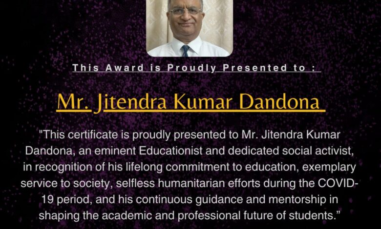 जितेंद्र कुमार डंडोना को विजन वैलनेस फाउंडेशन द्वारा विद्या रत्न अवॉर्ड से सम्मानित किया।