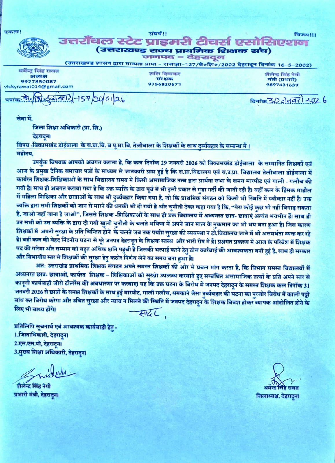 उपर्युक्त विषयक आपको अवगत कराना है, कि कल दिनाँक 29 जनवरी 2026 को विकासखंड डोईवाला के सम्मानित शिक्षकों एवं आज के प्रमुख दैनिक समाचार पत्रों के माध्यम से जानकारी प्राप्त हुई है कि रा.प्रा.विद्यालय एवं रा.उ.प्रा. विद्यालय तेलीवाला डोईवाला में कार्यरत शिक्षक-शिक्षिकाओं के साथ विद्यालय समय में किसी असामाजिक तत्व द्वारा प्रार्थना सभा के समय मारपीट एवं गाली – गलौच की गयी है।