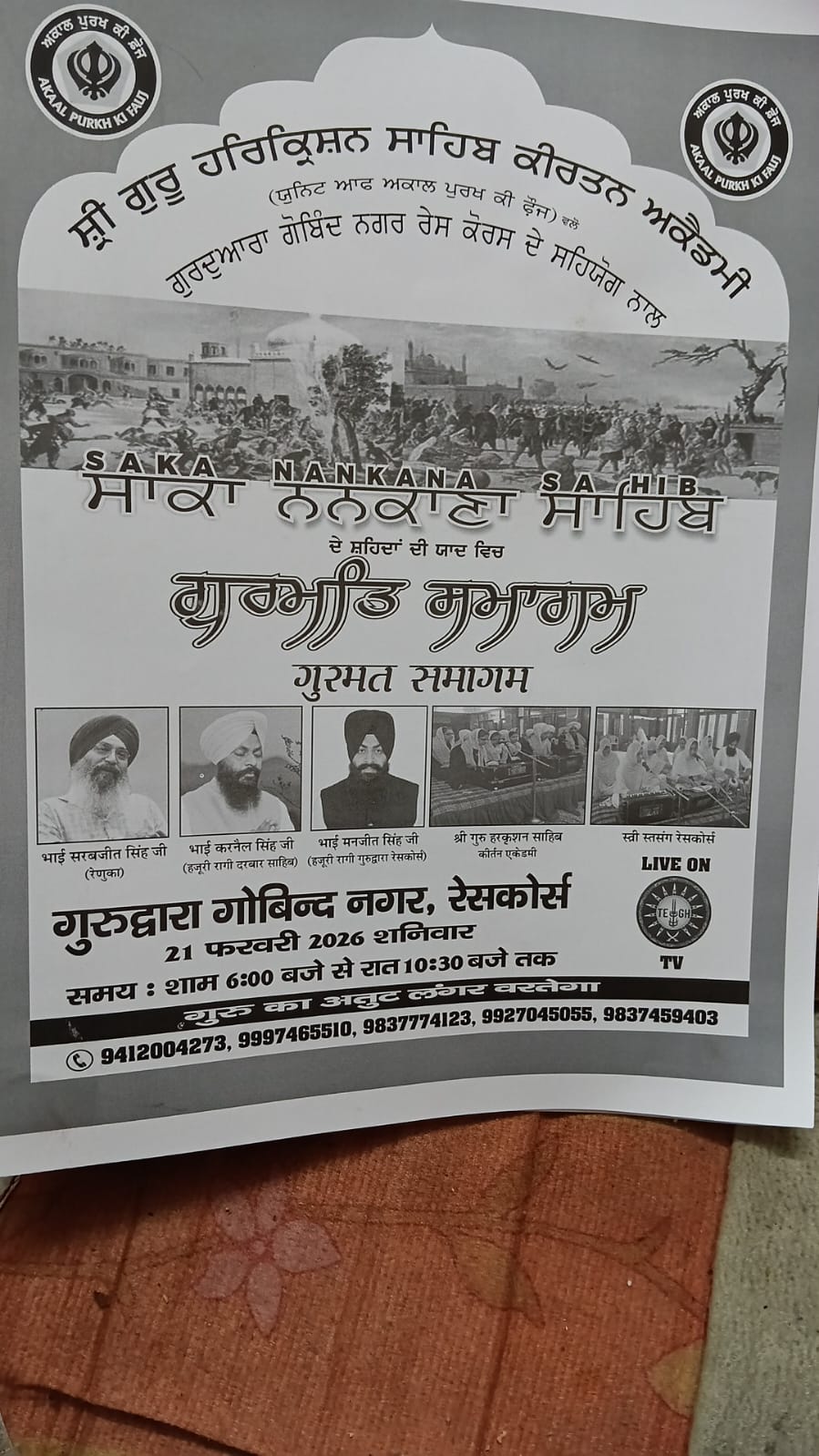 साका ननकाना साहिब दे शहीदों की याद में गुरमत समागम में संगत होंगी गुरबाणी की नाम वर्षा से निहाल रेसकोर्स गुरुद्वारे में दो दिवसीय गुरमत समागम का आयोजन किया जा रहा है जिसे देहरादून की संगतों के सहयोग से श्री गुरु हरकिशन साहिब कीर्तन अकादमी यूनिट ऑफ अकाल पुरख की फौज, गुरुद्वारा गोबिंद नगर रेसकोर्स, उत्तराखंड सिख कॉर्डिनेशन कमेटी, गुरमत प्रचार सभा, सुखमनी साहिब सेवा सोसायटी, स्त्री सत्संग के सहयोग से ये कार्यक्रम विशेष गुरमत दीवान 21 फरवरी 2026 शनिवार को गुरुद्वारा गोबिंद नगर रेसकोर्स में रात्रि 6.15बजे से रात्रि 10.30बजे तक निरंतर चलेंगे जिसमें जानकारी देते हुए उत्तराखंड सिख कॉर्डिनेशन कमेटी के गुरदीप सिंह सहोता ने बताया कि सर्वप्रथम 6.15बजे रह रास साहिब का पाठ होगा उसके उपरांत कीर्तन भाई मंजीत सिंह हजूरी रागी गुरुद्वारा गोबिंद नगर रेसकोर्स 6.45से 7.00बजे तक संगत को गुरुबाणी से जोड़ेकर संगत को निहाल करेंगे कीर्तन स्त्री सत्संग रेसकोर्स द्वारा 7.00से 7.30बजे तक किया जाएगा वही कीर्तन श्री गुरु हरकिशन साहिब कीर्तन अकादमी द्वारा 7.30से 8.30बजे तक कीर्तन द्वारा संगतों को निहाल किया जाएगा ।