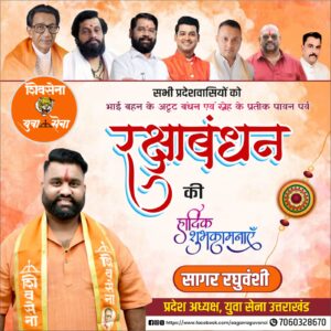 साथ आने वाले भाई बहन के रिश्ते को एक डोरी में पिरोता रक्षा बंधन पर्व की सभी उत्तराखंड के अपने भाई बहनों एवं सभी मातृशक्ति को हृदय से बधाई देता हु और आश्वासन देता हूं कि शिवसेना युवासेना उत्तराखंड का हर एक युवासेनिक उत्तराखंड की अपनी हर उस बहन बेटियों के लिए उसकी रक्षा के लिए प्रतिबद्ध है ।जैसे द्वापर युग में भगवान श्री कृष्ण ने द्रौपदी को अक्षय वस्त्र वरदान आशीर्वाद से उसकी लाज की रक्षा कौरवों से की थी क्योंकि द्रौपदी ने जब द्वापर में एक बार भगवान श्री कृष्ण को पतंग उड़ाने वक्त उनकी उंगली चोटिल होने पर अपने आंचल का एक कतरा तुरंत उनकी उंगली में बांध कर खून का बहाव रोक दिया था उसी वक्त भगवान श्री कृष्ण ने द्रौपदी को किसी भी वक्त संकट या जरूरत पड़ने पर उसकी रक्षा का वचन उसे अपनी बहन मानकर कर दिया था उसी प्रथा को साक्ष्य मानकर मैं राज्य प्रमुख युवासेना सागर रघुवंशी देवभूमि की अपनी हर एक सनातनी हिंदू बहन बेटी को इस पावन पर्व पर बधाई देते हुए उनकी रक्षा का वचन सभी शिवसेनिकों की ओर से देता हूं ।