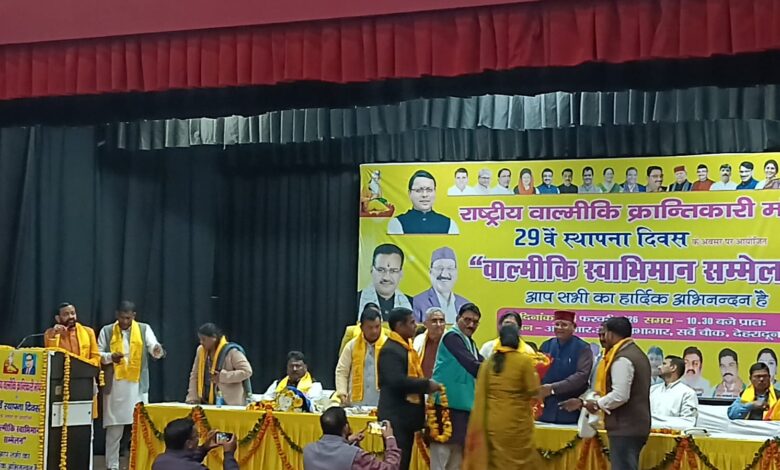 कार्यक्रम की अध्यक्षता वाल्मीकि क्रांतिकारी मोर्चा के राष्ट्रीय अध्यक्ष भगवत प्रसाद मकवाना के द्वारा किया गया इस अवसर पर पूरा ऑडोटोरियम पूर्ण रूप से भरा हुआ था जहां पूरे वातावरण में भगवान वाल्मीकि की जय जय कार के नारे आकाश में गुंजायमान हो रही थी न केवल उत्तराखंड के अलग अलग जिलों के इलावा यूपी से भी वाल्मीकि समाज का हजुम भी इसमें सम्मिलित हुआ वही वाल्मीकि स्वाभिमान सम्मेलन में जहां कैंट विधायक सविता कपूर उत्तराखंड सरकार में दायित्व धारी भाई श्याम अग्रवाल, मधु भट्ट, भगवत प्रसाद मकवाना व पूर्व में देहरादून के मेयर रहे सुनील उनियाल गामा, व वरिष्ठ भाजपा नेता अनिल गोयल भी उपस्थित रहे वाल्मीकि समाज के उत्थान हेतु उत्तराखंड की धामी सरकार ने कई महत्वपूर्ण योजनाओं को लागू किया है वही लगातार राष्ट्रीय वाल्मीकि क्रांतिकारी मोर्चा के राष्ट्रीय अध्यक्ष एवं उपाध्यक्ष राज्य मंत्री सफाई कर्मचारी आयोग उत्तराखंड सरकार भाई भगवत प्रसाद मकवाना ने सदैव वाल्मीकि समाज के आवाज को लगातार मजबूती से उठाया है और आगे भी वह लगातार निरंतर समाज की बेहतरी के लिऐ कार्य किया जा रहा है वाल्मीकि चौक जो कि कनक चौक में निर्माण हुआ हो वो भी राष्ट्रीय वाल्मीकि क्रांतिकारी मोर्चा व भगवत प्रसाद मकवाना जी के प्रयास से संभव हुआ है वही राजेश राजौरिया राष्ट्रीय महामंत्री ने कहा कि उत्तराखंड में लगातार संगठन मजबूती से लगातार आवाज उठा रहा है वही जयपाल वाल्मीकि ने कहा कि ये दुर्भाग्य पूर्ण हैं कि आज तक वाल्मीकि समाज के एक भी व्यक्ति को विधायक का टिकट न मिलना भी दर्शा रहा कि अभी तक कही न कही उपेक्षा हो रही है आशा है कि उत्तराखंड में भी स्थिति बदलेगी और वाल्मीकि समाज को आखिर कब भारतीय जनता पार्टी विधायक का टिकट देंगी या केवल वोट बैंक ही बना रहेगा आशा है कि भारतीय जनता पार्टी इस स्थिति को बदलेगी आशा है कि पूरा परिदृश्य बदलेगा और वाल्मीकि समाज का भी सशक्तिकरण होंगा वहीं राजपुर विधायक खजान दास ने कहा कि उत्तराखंड की धामी सरकार लगातार जनकल्याण के कार्य कर रही है और वाल्मीकि समाज के लिए भी जनकल्याण की अनेकों योजनाओं का लाभ दिया जा रहा है और भारतीय जनता पार्टी की सरकार में अंतिम व्यक्ति तक योजनाओं का लाभ दिला कर सशक्तिकरण करना ही ध्येय है ।